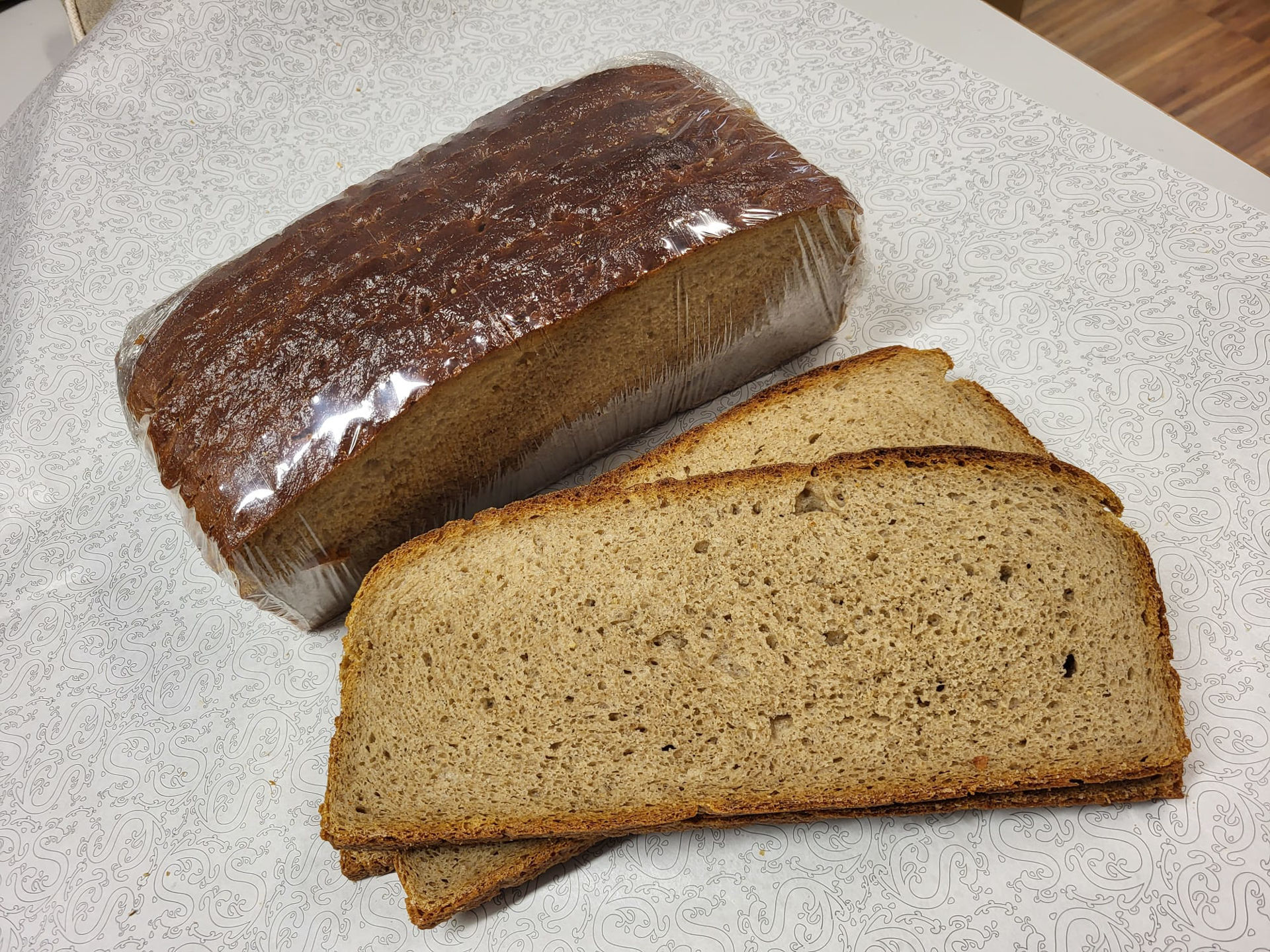Inhaltsstoffe: Roggenmehl, Weizenmehl, Wasser, Natursauerteig (Wasser, Roggenmehl),Natursteinsalz, Backhefe, geröstetes Roggenmehl, Weizenkleber, Rapslecithin, Brotgewürz (Anis, Fenchel, Koriander, Kümmel);