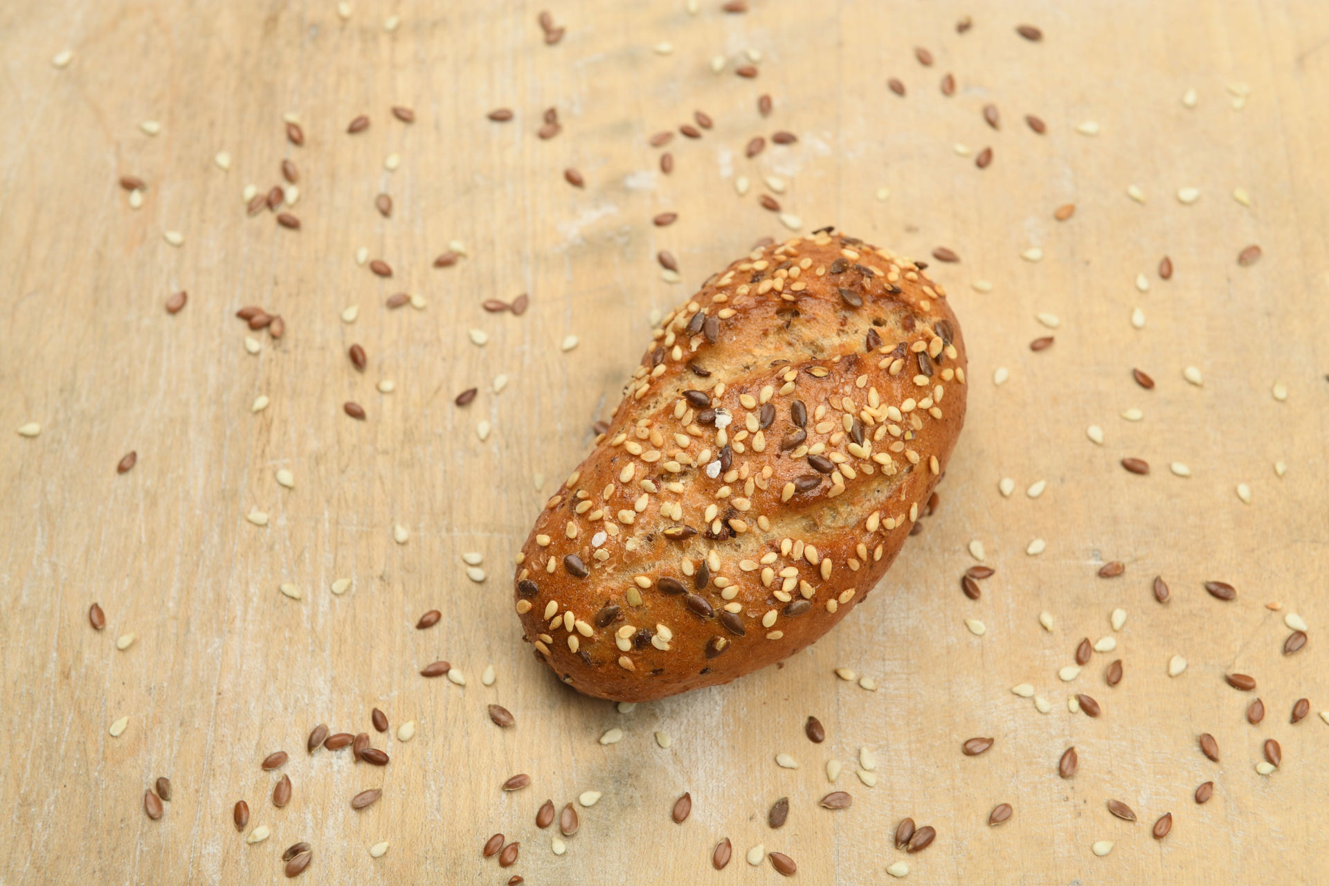 Inhaltsstoffe: Weizenmehl, Wasser, Leinsamen, Sojaschrot, Roggenmalz, Weizenflocken, Roggenvollkornschrot, Gewürze (Fenchel, Anis, Kümmel, Koriander), Natursteinsalz, Backhefe, Rapsöl, Traubenzucker, Emulgator (Lecithin), Stabilisatoren (Natriumcarboxymethylcellulose), Sauermolkepulver Bestreuung: Sesam, Leinsamen, Streusalz, geröstete Gewürze (Anis, Kümmel, Fenchel, Koriander), Weizenmehl;