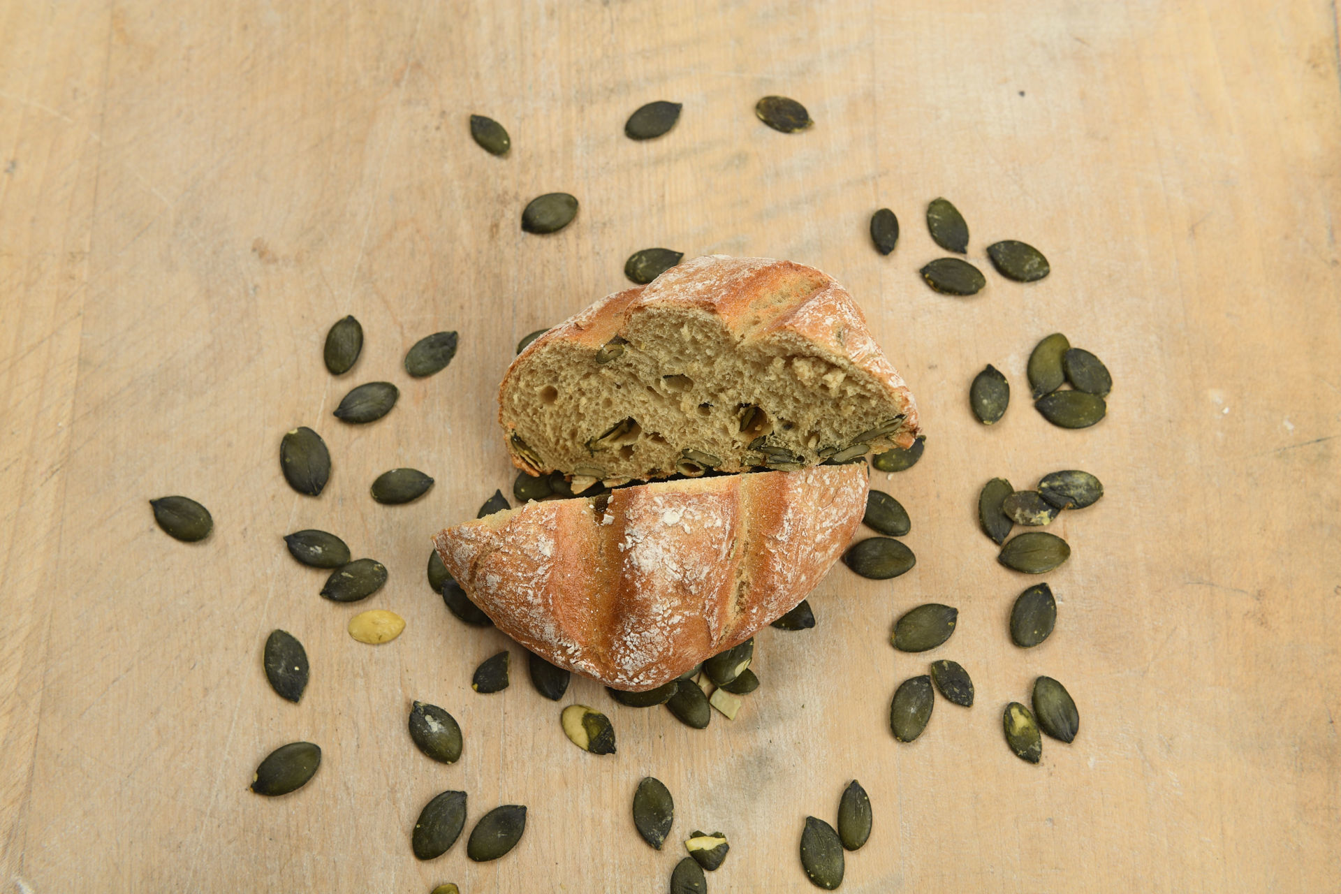Inhaltsstoffe: Weizenmehl, Roggenmehl, Wasser, Kürbiskerne, Backhefe, Natursteinsalz, Kürbiskernöl kalt gepresst, Roggensauerteig (Wasser, Roggenmehl), Guarkernmehl, Dextrose, Rapslecithin, Weizenmalzmehl, Trennmittel (Calciumphosphat), Rapsöl Bestreuung: Roggenmehl, Kürbiskerne;