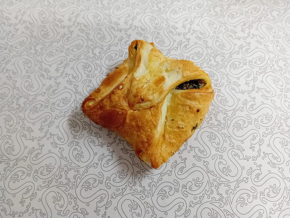Inhaltsstoffe: Weizenmehl, Salz, Eier, Hefe, Zucker, Butter, Ziehfett, Wasser, Ascorbinsäure, Backmittel. Fülle: Blattspinat, Knoblauch, Zwiebel, Feta, Eier, Salz, Pfeffer, Muskat ;